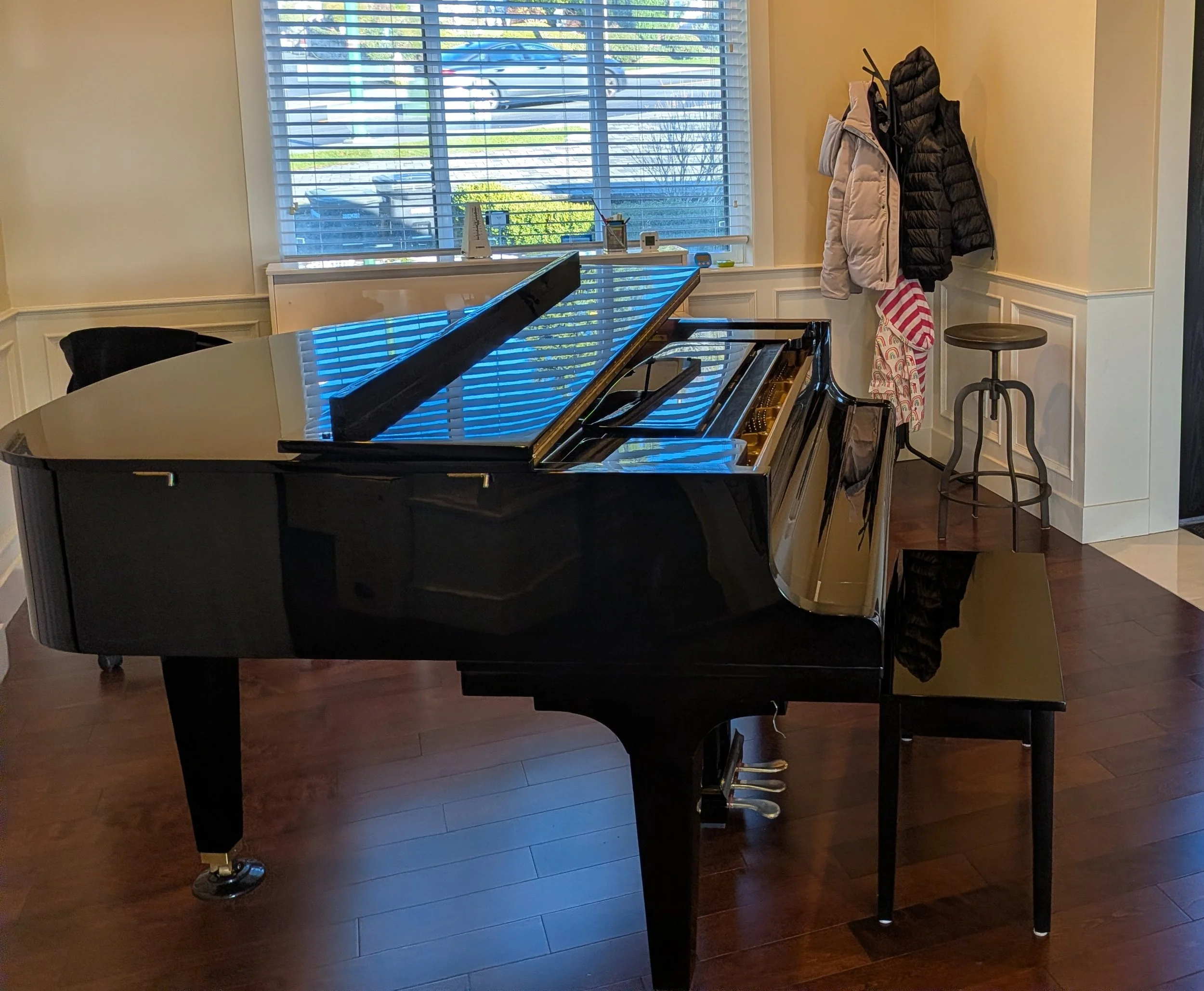 The studio is equipped with two pianos. Students learn on a grand piano, while a second piano is used for side-by-side demonstrations. This allows me to correct rhythm and show demonstration more clearly and efficiently during lessons.